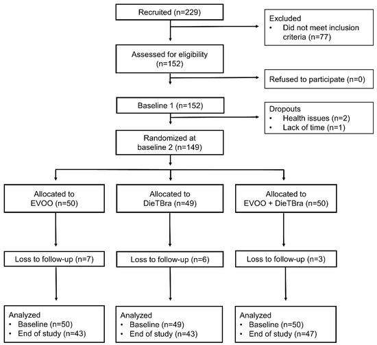 Randomization was performed at the randomization.com website. The 149 individuals were allocated in a proportion of 1:1:1 into the following three intervention groups: (1) 52 mL/day of EVOO (n = 50); (2) DieTBra (n = 49); and (3) DieTBra plus 52 mL/day of EVOO (DieTBra + EVOO, n = 50).