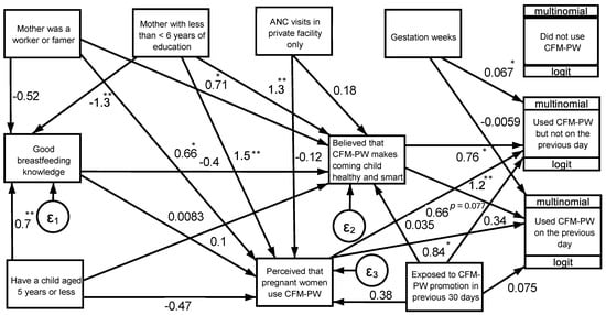Structural equation modeling (SEM) analysis for association among beliefs and social norms and use of commercial milk for pregnant women (CMF-PW). Boxes indicate measured variables; arrows indicate direction of association; and values are coefficient, n = 268. * p < 0.05, ** p < 0.01, other p < 0.10 were indicated by exact value.