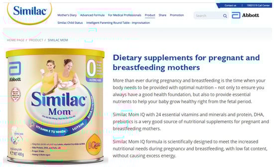 - Abbott. Similac Mom IQEye: Dietary Supplements for Pregnant and Breastfeeding Mothers. Available online: https://similac.com.vn/san-pham/similac-mom (accessed on 20 August 2021).