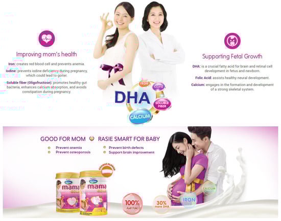 - Vinamilk. Dielac Mama Gold: Healthy Moms, Smart Babies. Available online: https://www.vinamilk.com.vn/sua-bot-vinamilk/en/product/dielac-mama-en/ (accessed on 20 August 2021).
