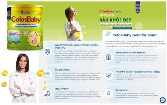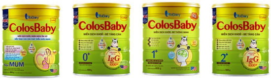 - VitaDairy. ColosBaby Gold for Mum. Available online: https://vitadairy.vn/en/products/product-for-mums/colosbaby-gold-for-mum (accessed on 26 August 2021).