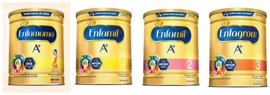 - MeadJohnson Nutrition. Products from Enfa+. Available online: https://www.enfa.com.vn/san-pham/sua-cho-me-mang-thai-va-cho-con-bu (accessed on 20 August 2021).