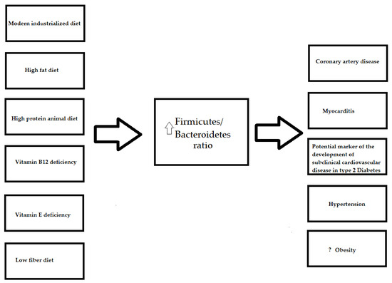 Despite findings, with regard to the profiles of particular microorganisms in relation to diet, differing between studies, the most common result is the change in the Firmicutes/Bacteroidetes ratio. The Firmicutes/Bacteroidetes ratio, which is considered to be an indicator for gut dysbiosis, seems to increase in an unhealthy diet pattern, such as the modern industrialized diet, which includes a high amount of fat, animal protein and a lack of vitamin B12 and E (Figure 1). A higher Firmicutes/Bacteroidetes ratio is related to many inflammatory and metabolic disorders, including cardiovascular pathologies [12,13,19,117,118,119,120,121]. Although, in general, results of the intervention and observational studies confirm Bacteroidetes decrease and Firmicutes increase in obese humans [122] and animals [123], a meta-analysis performed by Sze M.C. et al. did not confirm such an association [124]. Therefore, further interventional studies across a large population are required to elucidate the relationship between the Firmicutes/Bacteroidetes ratio and obesity.