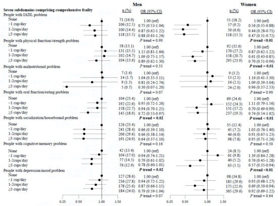 Multivariate-adjusted odds ratios (OR) and 95% confidence intervals (CI) of the seven subdomains that constitute comprehensive frailty according to green tea consumption. Adjusted for age (years), body mass index (kg/m2), total energy intake (kcal/day), alcohol status (everyday, sometimes, seldom, or never), smoking status (everyday, sometimes, former, or never), vegetable intake, fruit intake, and coffee consumption (almost none, <1 cup/day, 1–2 cups/day, ≥3 cups/day).