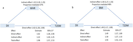 - Laouali, N.; Mancini, F.R.; Hajji-Louati, M.; El Fatouhi, D.; Balkau, B.; Boutron-Ruault, M.C.; Bonnet, F.; Fagherazzi, G. Dietary inflammatory index and type 2 diabetes risk in a prospective cohort of 70,991 women followed for 20 years: The mediating role of BMI. Diabetologia 2019, 62, 2222–2232. [Google Scholar] [CrossRef]