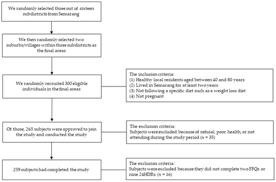The subjects were recruited using a multi-stage cluster random sampling in Semarang (Figure 1). First, three out of sixteen subdistricts were chosen randomly. Then, two suburbs/villages within the three subdistricts were randomly elected as the final areas. Finally, we randomly recruited 300 eligible individuals to join this study. The inclusion criteria were healthy local residents aged between 40 and 80 years and lived in Semarang for at least two years, not following a specific diet such as a weight loss diet and not pregnant. Among the 300 chosen subjects, 265 individuals were approved to join our study and conducted the study (response rate = 88.3%). Some subjects did not participate in our study because of refusal, poor health, or not attending during the study period. Semarang, the capital city of Central Java in Indonesia, is divided into lowland and highland areas and slum areas in the urban region. Semarang represents Indonesian characteristics, including demographics and lifestyle and provides a good overview of Indonesian people [18].