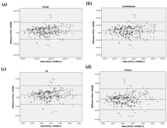 Bland-Altman plots for the intakes of energy (kcal) (a), carbohydrate (g) (b), fat (g) (c) and protein (g) (d). The difference between the mean estimate of energy and macronutrient intakes by two dietary assessment methods (y-axis) was plotted against the mean of nutrients measured by two dietary assessment methods (x-axis). FFQ: food frequency questionnaire, 24HDR: 24 h dietary recall.
