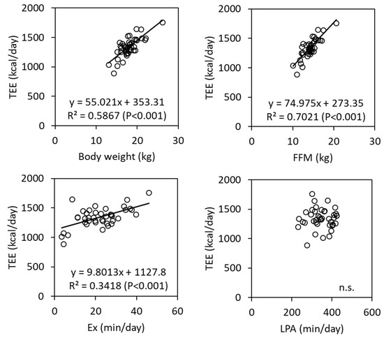 Scatter plots between total energy expenditure (TEE) and body weight, fat free mass (FFM), exercise duration (Ex), and light-intensity activity (LPA).