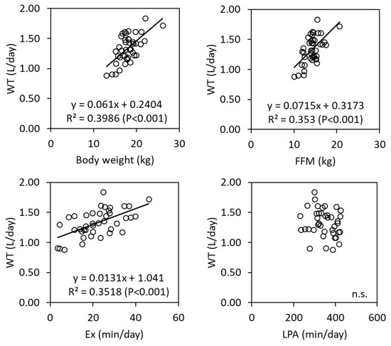 Scatter plots between water turnover (WT) and body weight, fat free mass (FFM), exercise duration (Ex), and light intensity activity (LPA).