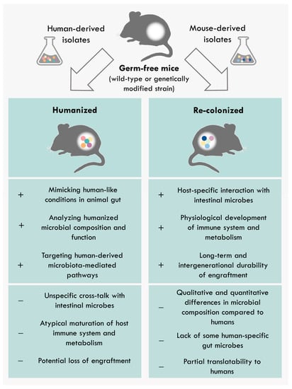 Advantages/limitations of gnotobiotic animals colonized with human-derived or model-derived communities. Predominantly used gnotobiotic animal models are gnotobiotic mice. Gnotobiotic mice are highly controlled in regard to their microbial environment, genetics, and diet. Germ-free mice can be associated with human-derived or mouse-derived communities to perform mechanistic studies to decipher microbial role in the host physiology or pathology under highly standardized conditions.