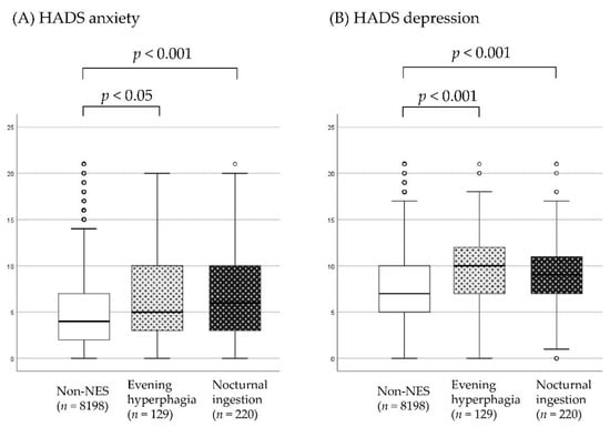 Box-and-whisker plot showing the Hospital Anxiety and Depression Scale (HADS) scores of the non-night eating syndrome (non-NES), evening hyperphagia, and nocturnal ingestion groups. HADs anxiety and depression scores are shown in (A,B), respectively. Comparisons were made using the Mann-Whitney U test.