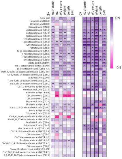 Relationships between infant lipid intake and infant growth characteristics. (A) Monthly intake and growth characteristics, (B) Mean six-month intake and six-month growth characteristics. Dark purple represents strongest positive correlation, and dark pink represents strongest negative correlation. * Indicates p < 0.05, ** indicates p < 0.01, *** indicates p < 0.001 (p < 0.001 is significant after accounting for multiple comparisons).
