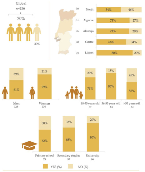 The study had a cross-sectional descriptive and observational design and was based on the application of a series of personal and individual surveys to each of the participants at street level. The study protocol was approved by the Clinical Research Ethics Committee of CEU San Pablo University, with the approval code 447/20/27. The selection of the individuals to be surveyed was carried out in a random and stratified manner, taking into account the representativeness of the five regions corresponding to the NUTS II areas of Portugal (Center, Lisbon Metropolitan Area, North, Alentejo, and Algarve) [21]. As inclusion criteria were considered: (I) any person over 18 years of age who lives in Portugal with a minimum residence time of 1 year and (II) any person who agreed to sign the informed consent. According to the population residing in Portugal over 18 years of age, assuming a global error of ±6.2% for a normal asymptotic confidence interval with a bilateral 95.5% correction for finite populations, considering an infinitive universe and estimation of equally probable categories (p = q = 50%), a sample of 256 people were included in the study. Once the study target was selected, a first contact or pilot test was planned in order to guarantee an optimal design and the adequacy of the questionnaires to be applied, before proceeding to their final validation and the launch of the work on the global field.