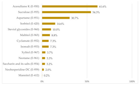 Figure 3 shows the prevalence of the different types of LNCS found in the evaluated products consumed by the Portuguese population, expressed as a percentage of foodstuffs consumed with that particular LNCS with respect to the total products consumed with LNCS. The most declared LNCS in the different food groups studied were acesulfame K (E-950) and sucralose (E-955) with a proportion of 61.6% and 54.3%, respectively, followed by aspartame (E-951) with 30.7%, and sorbitol (E-420) with 14.6%. The rest of the LNCS showed a presence lower than 10%.