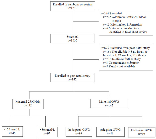 - Aghajafari, F.; Field, C.J.; Kaplan, B.J.; Maggiore, J.A.; O’Beirne, M.; Hanley, D.A.; Eliasziw, M.; Dewey, D.; Ross, S.; Rabi, D.; et al. The high prevalence of vitamin D insufficiency in cord blood in Calgary, Alberta (APrON-D Study). J. Obstet. Gynaecol. Can. 2017, 39, 347–353.e1. [Google Scholar] [CrossRef] [PubMed]