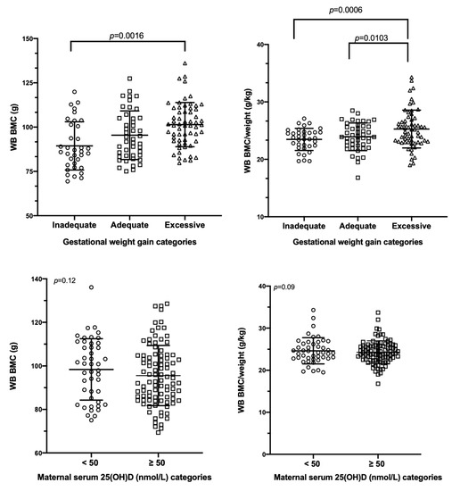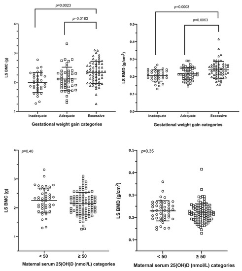 - Monjardino, T.; Henriques, A.; Moreira, C.; Rodrigues, T.; Adubeiro, N.; Nogueira, L.; Cooper, C.; Santos, A.C.; Lucas, R. Gestational weight gain and offspring bone mass: Different associations in healthy weight versus overweight women. J. Bone Miner. Res. 2019, 34, 38–48. [Google Scholar] [CrossRef] [Green Version]