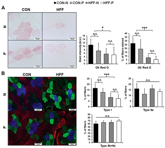 Effect of high-fructose, high-fat diet (HFF) on intramyocellular lipid (IMCL) content and skeletal muscle fiber type in juvenile Iberian pigs (n = 20). (A) Representative image of Oil red O (ORO) staining of longissimus dorsi muscle fibers [400× total magnification] with percentage of fibers staining with ORO (n = 3646) and ORO stain intensity (n = 918) (arbitrary units (AU)) demonstrating decreased IMCL in HFF-fed compared with CON-fed pigs; (B) representative image of immunohistochemical fiber typing of longissimus dorsi muscle [400× total magnification] with the total percentage of type I, type IIa, and type IIb/x fibers stained (n = 12682) indicating a decrease in type I slow oxidative fibers. Blue stained cells—Type I skeletal muscle fibers; green-stained cells—Type IIa; red-stained cells—Type IIb; unstained cells—Type IIx; CON—control; CON-N—control diet without probiotic supplementation; CON-P—control diet with probiotic supplementation; HFF-N—high-fructose, high-fat diet without probiotic supplementation; HFF—P-high-fructose, high-fat diet with probiotic supplementation. Statistical significance between groups is indicated by * (p ≤ 0.05), *** (p ≤ 0.001). Non-significant differences between groups are indicated by “n.s.’’.
