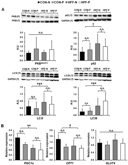 Increased autophagy and decreased lipid metabolism in skeletal muscle of juvenile Iberian pigs fed a high-fructose, high-fat diet (HFF) in the absence of insulin resistance. (A) Western blots of microtubule-associated protein 1 light chain 3 I (LC3I), microtubule-associated protein 1 light chain 3 II (LC3II), ubiquitin-binding protein (p62), and the ratio of phosphorylated to total protein kinase B (PKB Ser 473) in longissimus dorsi muscle indicating an increase in autophagy of HFF-fed versus CON-fed pigs with no change in insulin sensitivity; (B) gene expression of peroxisome proliferator-activated receptor gamma coactivator 1 alpha (PGC1α), carnitine palmitoyltransferase I (CPT1), and glucose transporter type 4 (GLUT4) in longissimus dorsi muscle as measured by qPCR demonstrating a significant decrease in genes encoding proteins imperative to lipid metabolism and β-oxidation. CON—control; CON-N—control diet without probiotic supplementation; CON-P—control diet with probiotic supplementation; HFF-N—high-fructose, high-fat diet without probiotic supplementation; HFF—P-high-fructose, high-fat diet with probiotic supplementation; qPCR—quantitative polymerase chain reaction. Statistical significance between groups is indicated by * (p ≤ 0.05), ** (p ≤ 0.01), and *** (p ≤ 0.001). Moderate trends indicated by † (p ≤ 0.1). Non-significant differences between groups are indicated by “n.s.’’.
