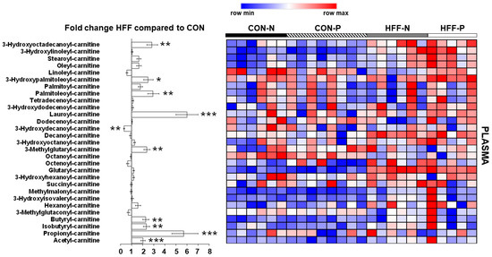 Effect of high-fructose, high-fat diet (HFF) on plasma metabolites related to dysregulated skeletal muscle composition and metabolism in juvenile Iberian pigs. Levels of several acylcarnitines are increased in plasma of HFF-fed versus CON-fed pigs, indicating dysregulated lipid metabolism. CON—control; CON-N—control diet without probiotic supplementation; CON-P—control diet with probiotic supplementation; HFF-N—high-fructose, high-fat diet without probiotic supplementation; HFF—P-high-fructose, high-fat diet with probiotic supplementation. Statistical significance between groups is indicated by * (p ≤ 0.05), ** (p ≤ 0.01), and *** (p ≤ 0.001).