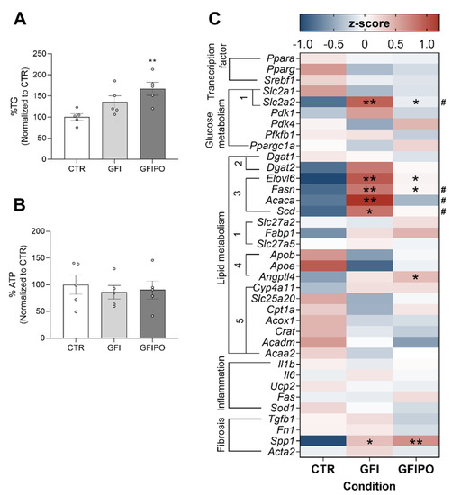Induction and characterisation of steatosis in PCLS. (A) TG levels and (B) ATP concentration after 48 h incubation with GFI or GFIPO medium, compared to CTR. Data are presented as mean percentage ± SEM. (C) Heat map of mRNA levels of genes encoding transcription factors, transporters (1) and enzymes (2: triglyceride assembly, 3: lipid synthesis, 4: FA efflux, 5: FA oxidation) involved in glucose and fatty acid metabolism, inflammation and fibrosis after 48 h incubation in CTR, GFI or GFIPO medium. Medium compositions were abbreviated according to Table 1 (CTR = control; GFI = glucose, fructose, and insulin; and GFIPO = GFI plus palmitic acid and oleic acid). Differential expression is presented using Z-scores (red: high Z-score, upregulated; blue: low Z-score, downregulated). * = p < 0.05, ** = p < 0.01 compared to CTR, # = p < 0.05 compared between GFI and GFIPO. Individual values are shown as circles.
