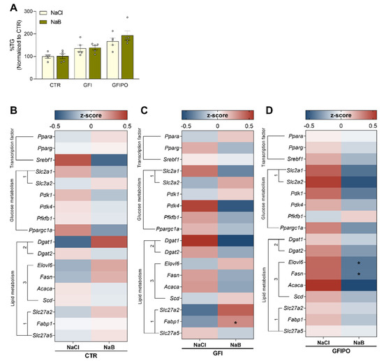 Effects of butyrate treatment on triglyceride accumulation and metabolism. (A) Relative TG levels in the three different media with 1 mM NaCl (control) or 1mM NaB (sodium butyrate). Data are presented as mean percentage of control ± SEM. (B–D) Heat maps of measured mRNA expression levels of genes related to lipid and glucose metabolism after culture in (B) CTR medium, (C) GFI medium, (D) GFIPO medium with 1 mM NaCl or 1mM NaB. Medium compositions were abbreviated according to Table 1 (CTR = control; GFI = glucose, fructose, and insulin; and GFIPO = GFI plus palmitic acid and oleic acid). Differential expression is presented using Z-scores (red: high Z-score, upregulated; blue: low Z-score, downregulated). * = p < 0.05 compared to NaCl. Individual values are shown as circles.