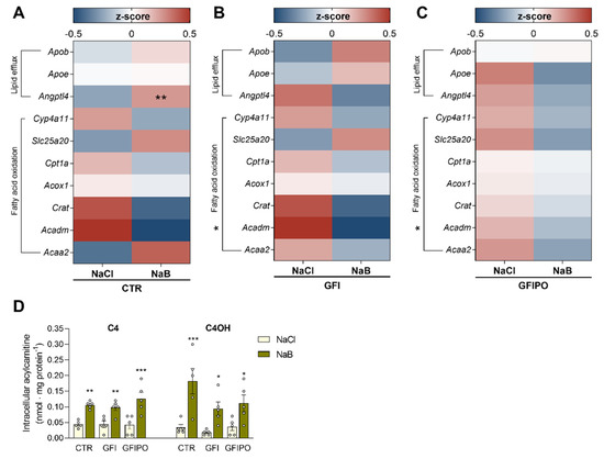 Effects of butyrate treatment on clearance and oxidation of fatty acids. Heat map of measured expression levels of genes related to lipid efflux (Apob, Apoe and Angptl4) and genes related to fatty acid oxidation (Slc25a20, Pdk4, Cyp4a11, Crat, Acox1, Acadm and Cpt1) after culture in (A) CTR medium, (B) GFI medium, (C) GFIPO medium with 1 mM NaCl (control) or 1 mM NaB (butyrate). Medium compositions were abbreviated according to Table 1 (CTR = control; GFI = glucose, fructose, and insulin; and GFIPO = GFI plus palmitic acid and oleic acid). Differential expression is presented using Z-scores (red: high Z-score, upregulated; blue: low Z-score, downregulated). (D) Intracellular butyrylcarnitine (C4) and hydroxybutyrylcarnitine (C4OH) quantification in CTR, GFI and GFIPO with 1 mM NaCl or 1 mM NaB. Data are presented as mean ± SEM. * = p < 0.05, ** = p < 0.01, *** = p < 0.001 compared to NaCl. Individual values are shown as circles.