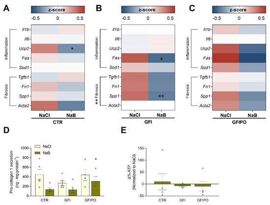 Effects of butyrate on inflammation and tissue remodelling. (A–C) Heat maps displaying mRNA expression of genes indicative of inflammation (Il1b, Il6, Ucp2, Fas, Sod1) and genes related to tissue remodelling (Tgfb1, Fn1, Spp1, Acta2) after culture in (A) CTR medium, (B) GFI medium, (C) GFIPO medium with 1 mM NaCl (control) or 1 mM NaB (butyrate). Differential expression is presented using Z-scores (red: high Z-score, upregulated; blue: low Z-score, downregulated). (D) Excreted pro-collagen Iα1 after culture in CTR, GFI and GFIPO medium with 1mM NaCl or 1mM NaB. (E) Difference in intracellular ATP content after culture with NaB as compared to NaCl. Medium compositions were abbreviated according to Table 1 (CTR = control; GFI = glucose, fructose, and insulin; and GFIPO = GFI plus palmitic acid and oleic acid). Data are presented as mean ± SEM.* = p < 0.05, ** = p < 0.01 compared to NaCl. Individual values are shown as circles.
