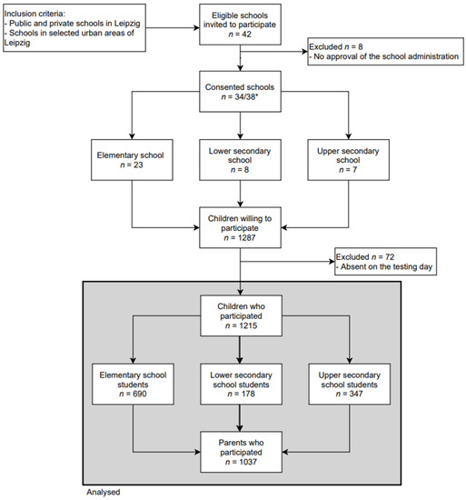 Data were collected within the cross-sectional Leipzig School Nutrition Study [24]. The study was conducted in public and private schools chosen from predefined areas in Leipzig, Germany. The areas were selected based on socioeconomic data and overweight prevalence described by Igel et al. [25]. Data collection took place between May 2018 and May 2019. After the local education authority approved the study, all 42 eligible schools were invited to participate, of which 34 agreed to participate. All fourth graders (elementary schools equivalent to ISCED1 (According to the UNESCO International Standard Classification of Education [26])) and grades 6–8 (lower resp. upper secondary schools equivalent to ISCED2 resp. ISCED3) were invited, written informed consent was obtained from parents of 1215 participating children and adolescents (see Figure 1 for rates).