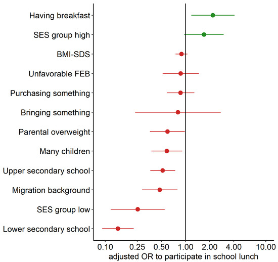 Bivariate associations between participation in school lunch as outcome and independent variables were estimated using logistic regression, adjusting for age and gender if necessary. Age, gender, school type, BMI-SDS, SES group, migration background, parental overweight, many children, FEB, having breakfast on schooldays, purchasing, and bringing something were included as independent variables.