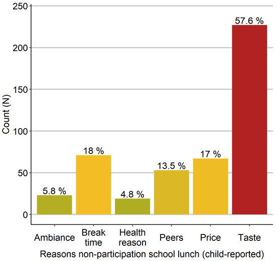 One-third of the students (32.8%; n = 394) did not participate in school lunch. As shown in Figure 3, the nonparticipating children stated most frequently that they did not like the taste, whereas a minority reported a special diet due to health reasons (e.g., allergies, food intolerances). Notably, the price was as decisive a reason for nonparticipation as the break time.