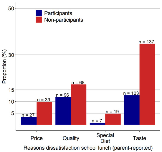 The most frequently reported reason for nonparticipation was the taste, which cannot be assessed objectively. As second most frequently reported reasons for nonparticipation, children stated the price and the break time (17% and 18%, respectively). Thus, we confirmed school- and lunch-related factors as critical in deciding for or against school lunch participation, as found in a German nationwide survey [6,37]. This finding agrees with qualitative and quantitative American research showing that students’ perceptions of food quality and school conditions, like long cafeteria lines and time constraints, are decisive regarding participation [19,21]. Finally, participants’ parents were three times more likely to be satisfied with the school lunch than non-participants’ parents, suggesting a strong dependence of parental perception regarding participation, which is in line with American research findings [20]. The authors found parental perception of the nutritional quality of school meals to be a significant predictor of participation, regardless of socioeconomic position. Furthermore, three times as many non-participants’ parents stated price or taste as a reason for dissatisfaction compared to participants’ parents.