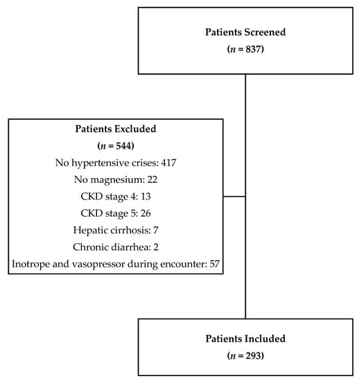 Patients eighteen years of age or older with an international classification disease ninth revision (ICD-9) code of 401.9 (hypertensive crises: emergency or urgency) and a documented serum magnesium level on their electronic medical record (during the hypertensive crises hospital admission) were included in the study. Hypertensive crisis was defined as systolic blood pressure (SBP) greater than 180 mmHg and/or diastolic blood pressure (DBP) greater than 120 mmHg [,]. Patients identified as having hypertensive crises based on ICD-9 codes were confirmed to have either SBP greater than 180 mmHg and/or DBP greater than 120 mmHg. Hypertensive crisis was classified as either hypertensive urgency (absence of acute or on-going target organ damage) or hypertensive emergency (presence of acute or on-going target organ damage). Target organ damage by system included neurologic (hypertensive encephalopathy, intracranial hemorrhage, acute ischemic stroke), cardiac (acute myocardial infarction, acute left ventricular failure, unstable angina, dissecting aortic aneurysm), and renal (acute kidney injury). All diagnoses of target organ damage were confirmed with both clinical findings (laboratory results, imaging, signs, and symptoms) from the patients and the physician’s diagnosis, documented on the patients’ problem list. Hypertensive encephalopathy diagnosis was verified based on physical exam findings of headache and altered levels of consciousness. Diagnosis of intracranial hemorrhage and acute ischemic stroke was confirmed using a computed tomography (CT) scan or magnetic resonance imaging of the head with or without contrast, and was performed on patients with neurologic symptoms, which included changes in mental status or focal neurologic signs indicative of cerebrovascular accident or hemorrhage. Unstable angina diagnosis was made clinically and confirmed with documented new or sudden chest pain, while myocardial infarction diagnosis was confirmed with elevated serum troponin levels and electrocardiogram (EKG) findings. Acute left ventricular failure was diagnosed with echocardiographic findings of a decreased ejection fraction less than 40%, as well as physical exam findings of elevated jugular venous pressure (distension), crackles, or edema. Diagnosis of dissecting aortic aneurysm was confirmed via imaging studies revealing wide mediastinum on chest X-ray and/or chest CT scan with or without contrast. Acute kidney injury was defined as a serum creatinine (SCr) greater than 2 mg/dL, which is new-onset in the absence of prior renal disease and/or increases in SCr of 0.5 mg/dL or greater.