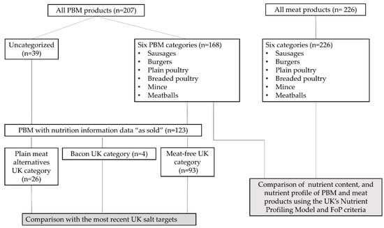 Nutrient data were collected from 207 PBM products. Of these, 168 products were grouped into six categories (sausages, burgers, plain poultry alternatives, breaded poultry alternatives, mince, and meatballs). Nutritional data were collected from 226 comparable meat products. Figure 1 shows the product’s selection process into the different analyses performed.