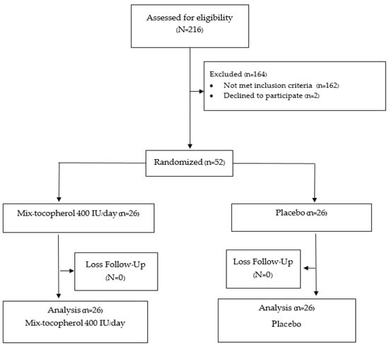 Postmenopausal osteopenic women were enrolled in the study between 1 May 2018 and 31 May 2019 at Menopause clinic, Department of Obstetrics and Gynecology, Faculty of Medicine, Ramathibodi Hospital, Bangkok. The informed and consent of study was obtained from all participants. Postmenopausal women with absent menstruation for at least one year, age over 45-year-old, osteopenia indicated by a bone mineral density measured by Dual-energy X-ray Absorptiometry T-score between −1 and −2.5 at the lumbar spine, total hip or femoral neck, and signed agreements to participate in the study were included. Exclusion criteria were serum 25-hydroxyvitamin D (serum 25(OH)D level) < 20 ng/mL, having a history of metabolic bone disease, having a history of cancer, having an eating disorder or malabsorption, taking a medication that affects bone metabolism, taking an anticoagulant, having taken a vitamin E supplement within 3 months, and unwillingness to accept the randomization. A pilot study was performed to estimate sample size from 16 participants. The means and standard deviation (SD) of C-terminal telopeptide of type I collagen (CTX) from both groups were measured and calculated by N4studies Application (Version 1.4.1). The mean in a treatment group (mixed-tocopherol supplement) was 0.35, and SD was 0.15. The mean in a control group (Placebo) was 0.55, and SD was 0.29. The ratio (control/treatment) = 1.00. Alpha (α) = 0.05, Z (0.975) = 1.959964, and Beta (β) = 0.20, Z (0.800) = 0.841621. Then, the calculated sample size was 21 participants in the treatment and an equal number in the control group. A 20% larger sample was used to accommodate for potential data loss. Finally, there were 26 participants in each group, or a total of 52 participants in this study.