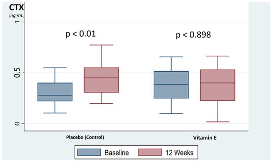 A comparison of the bone turnover markers, CTX and PINP, showed no significant difference between the vitamin E and placebo group at baseline and after 12 weeks of supplementation. However, the mean difference in the bone resorption marker, CTX, at baseline versus 12 weeks were significantly different between the vitamin E group and the placebo group (−0.003 ± 0.09 and 0.121 ± 0.15, respectively (p < 0.001)), and no difference was shown in the mean difference in the formative bone marker, PINP between the vitamin E group and placebo group (−0.25 ± 14.02 and 2.4 ± 10.88, respectively (p = 0.430)) as shown in Table 2. In addition, the placebo group was showed a significant increase in bone resorption marker, CTX, during the time period, up by 35.3% at 12 weeks compared with baseline (p < 0.001). Meanwhile, the vitamin E group showed no significant change of bone resorption marker at 12 weeks compared with baseline (p < 0.898), as shown in Figure 2. The bone formation markers in both groups were not significantly changed.