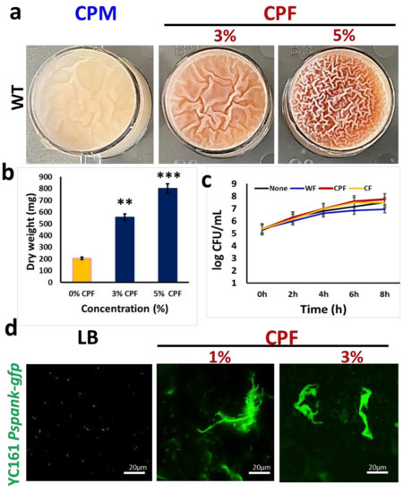The starter culture of B. subtilis was prepared as described above. LB broth was supplemented with different concentrations of the above-mentioned fibers. For pellicle formation assays, 5 μL of the starter culture was pipetted into media containing either 4 mL of LB, LB + CPF, LB + WF, or LB + CF into 12-well polystyrene plates. They were incubated at 30 °C supplemented with slight shaking (30 rpm for 72 h); the generated biofilms were visualized using either a regular camera (iPhone 11) or Nikon fluorescent microscope (Nikon Eclipse Ti2, Tokyo, Japan).
