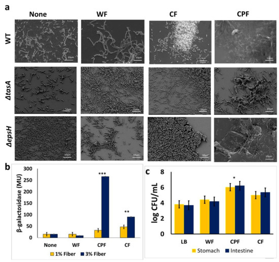 (a) An electron micrograph of B. subtilis cells (WT, ΔtasA, and ΔepsH) following 16 h of growth in LB (unsupplemented control) and LB supplemented with different prebiotic substances (WF, CPF, or CF). Images were taken at 1500× magnification. Scale bar: 10 µm; (b) measurement of tapA expression in the presence of prebiotic substances; B. subtilis cells harboring the transcriptional fusion of tapA promoter with a gene encoding for an enzyme β-Galactosidase (YC 121) were grown for 16 h in either LB or LB supplemented with the different prebiotic substances. The activity of the lacZ gene was assessed in Miller’s units. The graph shows the means ± SEMs of three measurements. ** p < 0.01 and *** p < 0.001 vs. the non-treated controls; (c) survivability of B. subtilis grown in different media during in vitro digestion. B. subtilis cells were incubated in LB medium supplemented with 1% (w/v) dietary fiber for 24 h after which it was further incubated at 37 °C with enzymes, pH modification like the conditions in the stomach. Unsupplemented LB served as a control. The graph shows the means ± SEMs of three measurements. * p < 0.05 vs. the non-treated controls.