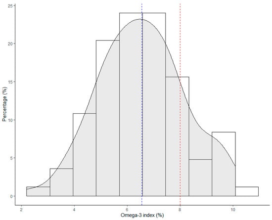 The distribution of the HS-Omega-3 Index values among athletes at screening. The red line indicates the threshold of optimal HS-Omega-3 Index (8%), while the blue line indicates the mean value of HS-Omega-3 Index (6.55%).