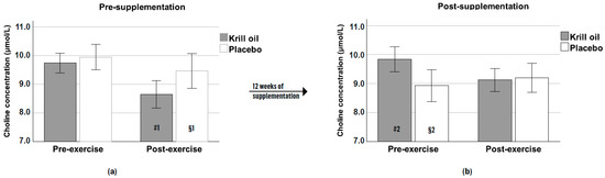 Complete choline data sets were available from a subsample of 21 participants. An inspection of Figure 3a reveals pre-supplementation decrements in choline levels from pre- to post-exercise in both groups (from 9.7 to 8.6 µmol/L in the krill oil group and 9.9 to 9.4 µmol/L in the placebo group), with a similar pattern also being shown in the krill oil group post-supplementation (Figure 3b). A mixed-design repeated measures ANOVA supports this interpretation of the data, revealing a significant main overall effect of exercise (pre-exercise; post-exercise) (F1,19 = 7.19, p = 0.015) across two time points (pre-supplementation; post supplementation), and a significant overall exercise × time point interaction effect (F1,19 = 3.17, p = 0.05) in the trial.