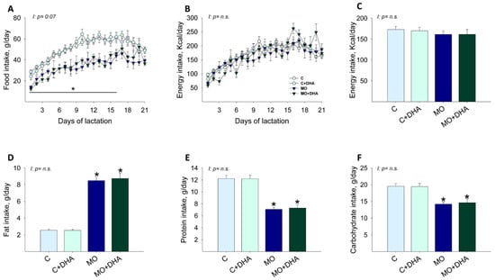 Maternal food, energy, and macronutrient intake during lactation. Control (C), control with DHA (C+DHA), maternal obesity (MO), and maternal obesity with DHA (MO+DHA). (A). food intake, g/day; (B). energy intake, kcal/day; (C). average energy intake during lactation, kcal/day; (D). fat intake, g/day; (E). protein intake, g/day; (F). carbohydrate intake, g/day. Values are mean ± SEM, n = 7–8 mothers per group. * different vs. their respective control, p < 0.05. I = interaction between maternal diet and maternal DHA supplementation, n.s. = not significant.