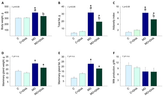 Maternal parameters at the end of lactation. Control (C), control with DHA (C+DHA), maternal obesity (MO), and maternal obesity with DHA (MO+DHA). (A). body weight, g; (B). total fat, g; (C). adiposity index; (D). mammary gland weight, g; (E). fat in mammary gland, %; (F). milk production, g/4h. Values are mean ± SEM, n = 7–8 mothers per group. Within the same group, means labeled with different letters differ, p < 0.05. * different vs. their respective control, p < 0.05. I = interaction between maternal diet and maternal DHA supplementation, n.s. = not significant.