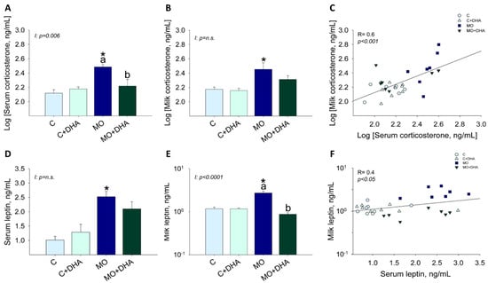 Maternal hormone concentrations at the end of lactation. Control (C), control with DHA (C+DHA), maternal obesity (MO), and maternal obesity with DHA (MO+DHA). (A). Log [serum corticosterone], ng/mL; (B). Log [milk corticosterone], ng/mL; (C). Log [milk corticosterone], ng/mL vs. Log [serum corticosterone], ng/mL correlation; (D). serum leptin, ng/mL; (E). milk leptin, ng/mL in log scale; (F). milk leptin, ng/mL in log scale vs. serum leptin, ng/mL correlation. Values are mean ± SEM, n = 7–8 mothers per group. Within the same group, means labeled with different letters differ, p < 0.05. * different vs. their respective control, p < 0.05. I = interaction between maternal diet and maternal DHA supplementation, n.s. = not significant. R = Pearson’s correlation.