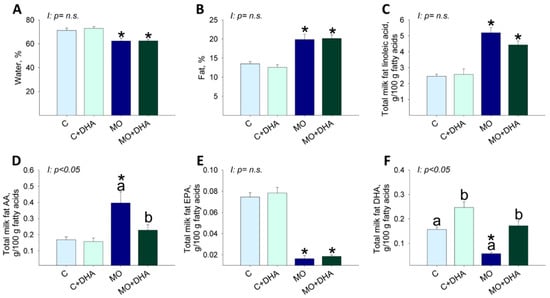 Maternal milk composition at the end of lactation. Control (C), control with DHA (C+DHA), maternal obesity (MO), and maternal obesity with DHA (MO+DHA). (A). water, %; (B). fat, %; (C). linoleic acid, %; (D). AA, %; (E). EPA, %; (F). DHA, %. Values are mean ± SEM, n = 7–8 rats from different litters. Within the same group, means labeled with different letters differ, p < 0.05. * different vs. their respective control, p < 0.05. I = interaction between maternal diet and maternal DHA supplementation, n.s. = not significant.