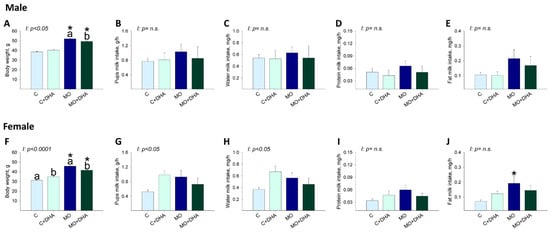 At the end of lactation, male and female pups’ body weight was higher in MO and MO+DHA than in C and C+DHA, respectively (Figure 5A,F). Maternal DHA supplementation reduced male and female pups’ body weight in MO+DHA compared to MO group; C+DHA female pups weighed more than C (Figure 5F). Across all groups, male pups consumed similar amounts of milk, water, protein, and fat (Figure 5B–E).