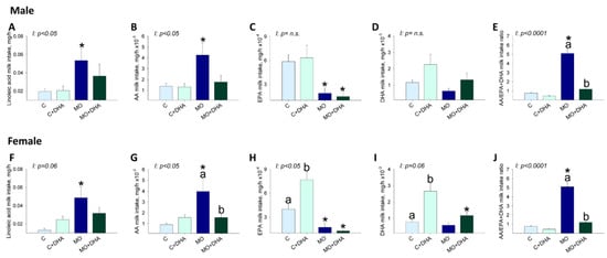 Milk linoleic acid intake was higher in male and female offspring from the MO group compared with C (Figure 6A,F), and maternal DHA supplementation did not reduce male (p = 0.09) or female (p = 0.07) milk linoleic acid intake. Milk AA intake was higher in male and female MO offspring compared to C, whereas maternal DHA supplementation reduced AA intake in female but not in male pups (p = 0.05) from the MO+DHA group compared to MO (Figure 6B,G). EPA intake was lower in both male and female pups from MO and MO+DHA compared to C and C+DHA (Figure 6C,H) but higher in female offspring from C+DHA vs. C (Figure 6H). Milk DHA intake was significantly higher in females from C+DHA group compared with C, while in MO + DHA females, DHA intake was lower than in C+DHA (Figure 6I); in males, DHA intake was similar among groups (Figure 6D). The AA/EPA+DHA milk intake ratio was similar in the C and C+DHA groups but higher in male and female MO offspring compared to C. The ratio of AA/EPA+DHA milk intake in MO+DHA offspring was reduced by maternal DHA supplementation (Figure 6E,J). Male and female ω-6 PUFA intake was higher in MO than in C. SFA intake was higher in female pups from MO compared to C, but unchanged in male pups. ω-3 PUFA and MSA milk intake were similar in males and females among all experimental groups (Table 2). Male and female pups from MO and MO+DHA groups had higher ω-6/ω-3 fatty acid intake ratios than C and C+DHA, respectively. Maternal DHA supplementation reduced the ω-6/ω-3 fatty acid intake ratios in C vs. C+DHA and MO+DHA vs. MO (Table 2).