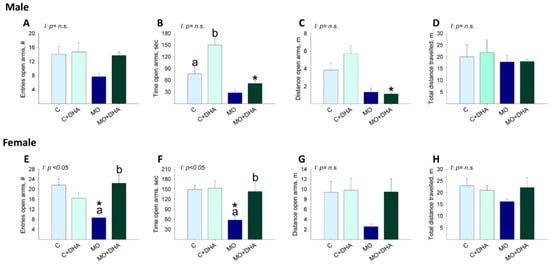 Female offspring behavior: MO F1 had fewer entries and spent less time in the open arms than C. Maternal DHA supplementation increased in MO+DHA the open arm entries, as well as time spent in the open arms compared with MO (Figure 7E,F). No differences were observed between groups in the distance traveled in the open arms or in the total distance traveled (Figure 7G,H).