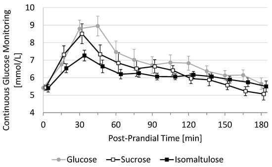 The post-prandial glycemic peak was highest for glucose (9.7 ± 0.61 mmol/L), followed by sucrose (9.3 ± 0.49, p = 0.501), intermittent sucrose (9.2 ± 0.45, p = 0.497), and isomaltulose (7.8 ± 0.27, p = 0.005). In terms of incremental Cmax, this translates into highest iCmax for glucose (4.3 ± 0.62 mmol/L), followed by sucrose (10% decrease, 3.9 ± 0.45, p = 0.488), intermittent sucrose (12% decrease, 3.8 ± 0.43, p = 0.503), and isomaltulose (45% decrease, 2.4 ± 0.31, p = 0.006). As for the iAUC, with N = 11 subjects, only the difference between glucose and isomaltulose appears to be statistically significant.
