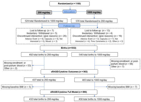 Analyses were performed on participants for whom both enrollment and delivery samples were available (n = 437, 200 mg per day; n = 465, 1000 mg/day) (Figure 1). sRAGE was measured using an ELISA-based format (MesoScale Diagnostics, Rockville, MD, USA) according to the manufacturer’s protocols and was analyzed independently. Cytokines, specifically IL-6, IL-1β, TNFα, and IFNγ, were measured on plasma samples using a similar multi-plex ELISA platform.