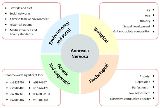 Although the etiology of AN remains unclear, there is evidence for disturbed appetite and behavioral pathways that could suggest the physiological origin. Furthermore, it is well established that neurological and genetic predispositions, as well as biological and psychological traits and early experiences in life, might sensitize the individual to stress and hypothalamic-pituitary-adrenal (HPA) axis dysregulation. This sensibility can be further aggravated with environmental and socio-cultural factors that may favor the onset of an eating disorder [,]. Thus, AN is postulated to have a multifactorial etiology, and certain conditions may promote the onset in a predisposed population (Figure 1).