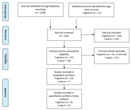 A comprehensive, systematic search of Medline (Ovid) and Google Scholar was performed from inception to August 2020. The original search terms were again used to conduct a search in October 2021 to find articles of interest published in the period between August 2020 and October 2021. Medline (Ovid) incorporated MeSH terms when appropriate and google scholar terms adapted accordingly (Refer to Table S1: Cognition—NIH Quality Assessment Tool for Controlled Trials). Patents and citations were excluded, the search limited to English language, and only the first 15 pages of returned results examined (Google Scholar). Titles and abstracts were systematically searched to identify peer-reviewed trials to identify those that indicated possible inclusion criteria, and duplicates and inappropriate texts were excluded. The full text of remaining papers was reviewed, and eligible studies included for the systematic review. Reference lists and reviews were manually searched for additional relevant studies for possible inclusion.